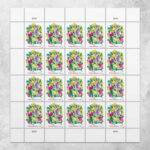 The stamp features a tableau of brilliantly colored, abstract flowers rendered in ink and gouache paint. Gouache is known for its lustrous color, which the artist used to create the vivid hues of red, yellow, purple, pink, green, and blue that grace this vertical floral illustration.